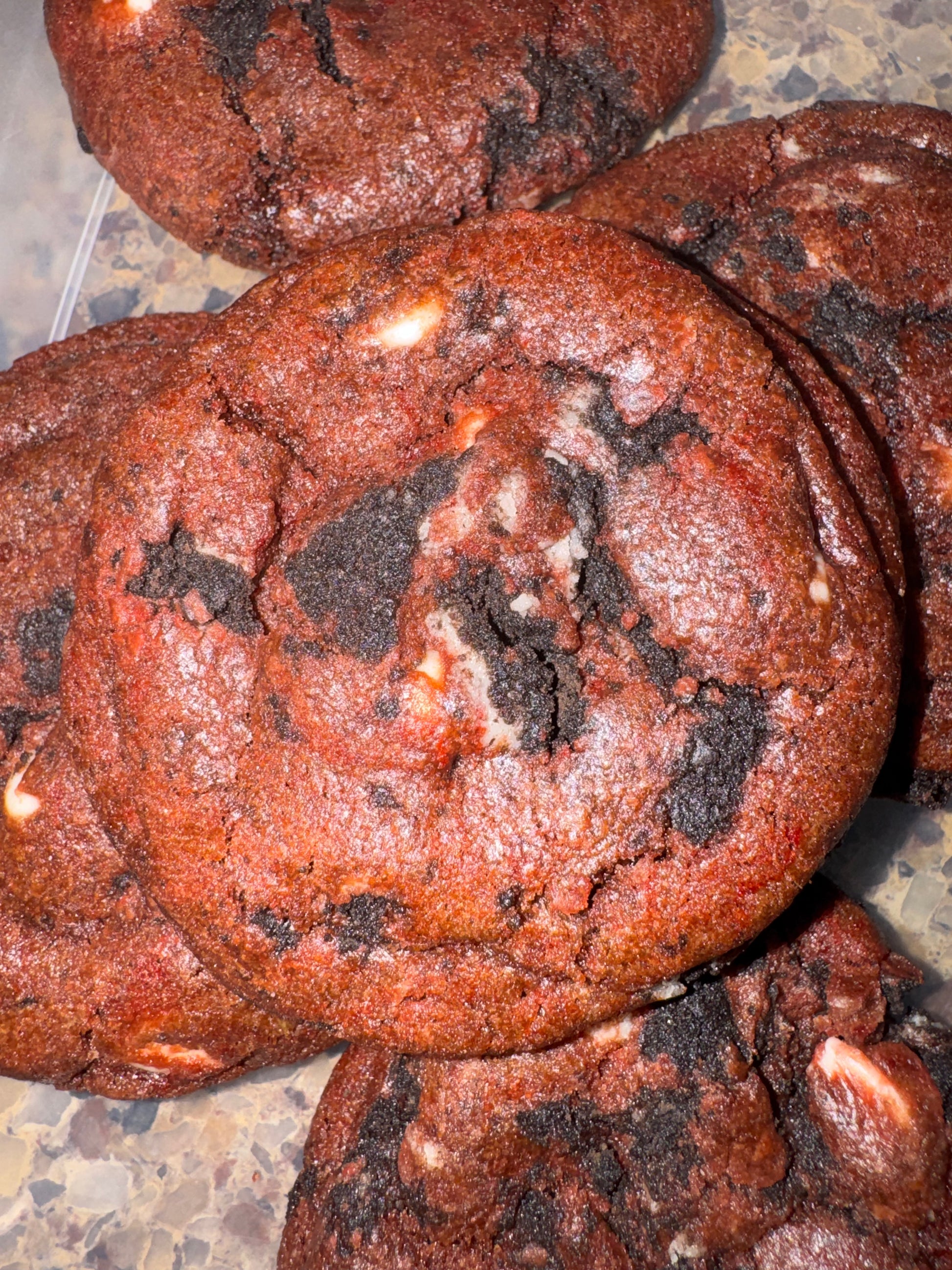 A rich red velvet cookie loaded with creamy white chocolate chips and chunks of Oreo — soft, indulgent, and perfectly dramatic in every bite. ❤️✨