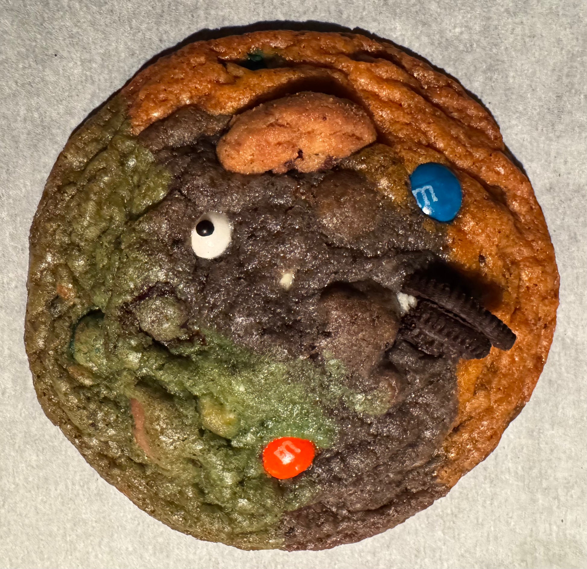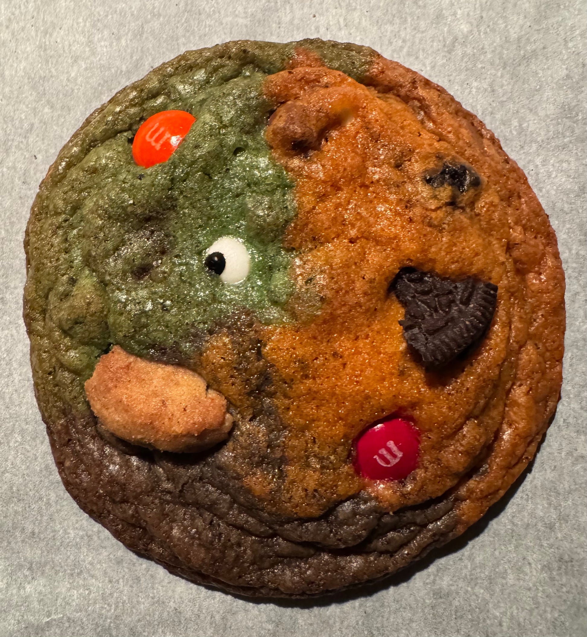 Ingredients: Butter (milk), brown sugar, sugar, egg, vanilla extract, salt, baking powder, baking soda, cornstarch, all-purpose flour (wheat), Oreos (wheat, soy), Chips Ahoy (wheat, soy), white chocolate chips (milk, soy), semi-sweet chocolate chips (milk, soy), M&Ms (milk, soy), peanut butter chips (peanuts, soy).